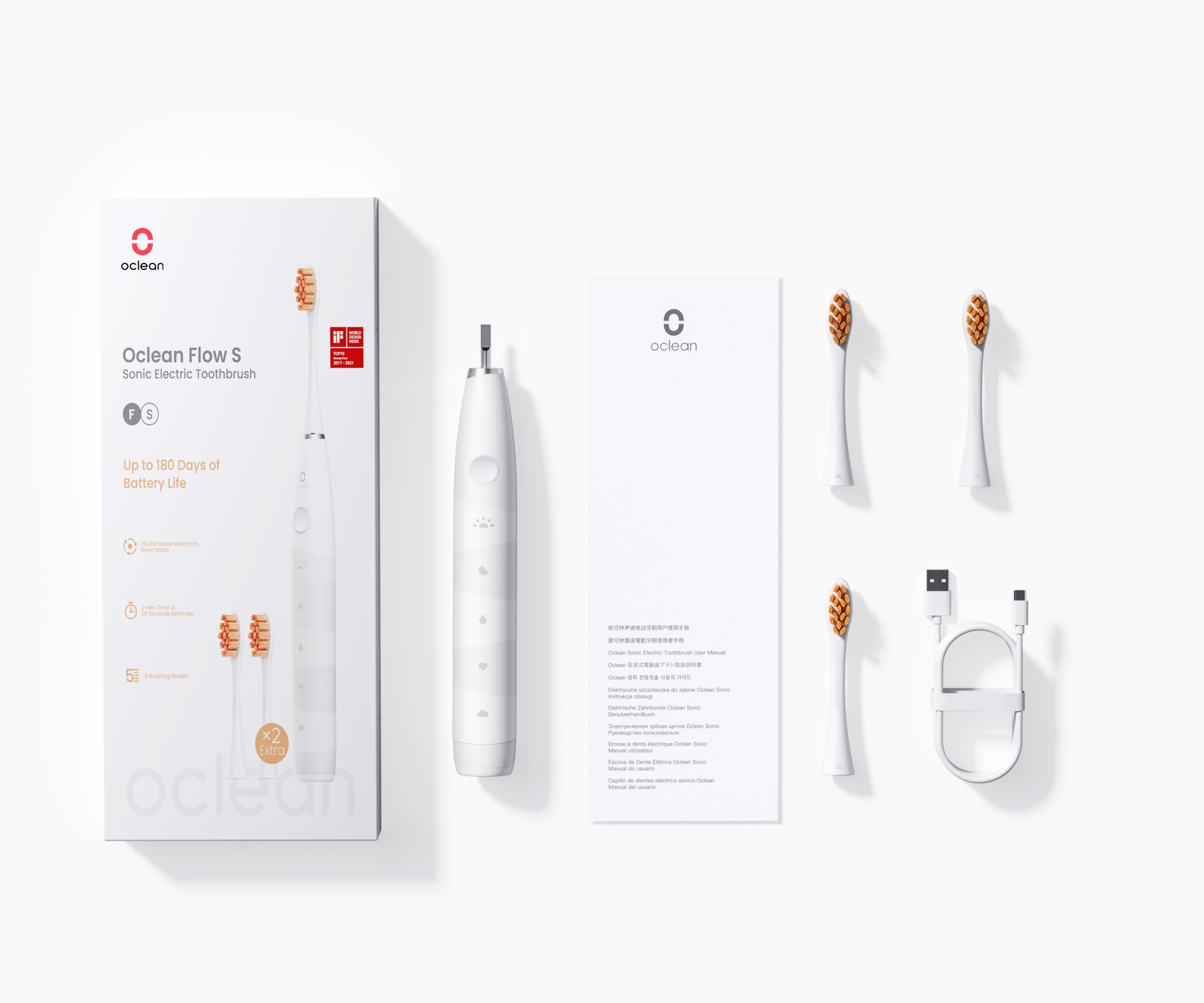Szczoteczkę Oclean FLOW otrzymasz w eleganckim, minimalistycznym pudełku, odpowiednio zabezpieczonym. W zestawie Oclean FLOW S z 3 końcówkami znajdziesz: