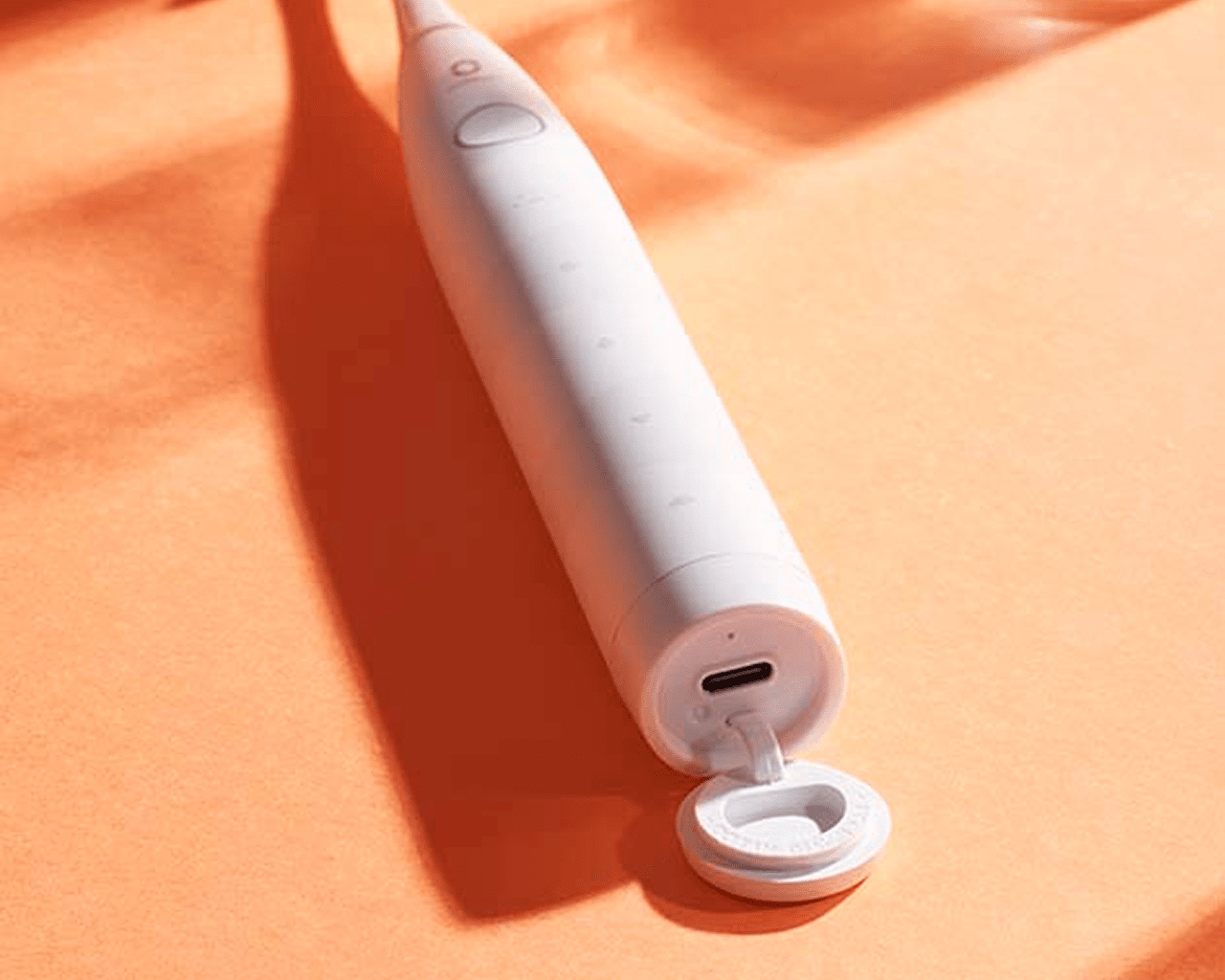 To najdłużej działająca Szczoteczka Oclean na jednym naładowaniu. Ładuje się ją raz na 180 dni* za pomocą standardowego kabla USB-C dołączonego do zestawu lub dowolnym innym kablem USB-C. Port ładowania USB-C ukryty jest za silikonową uszczelką na spodzie rękojeści.