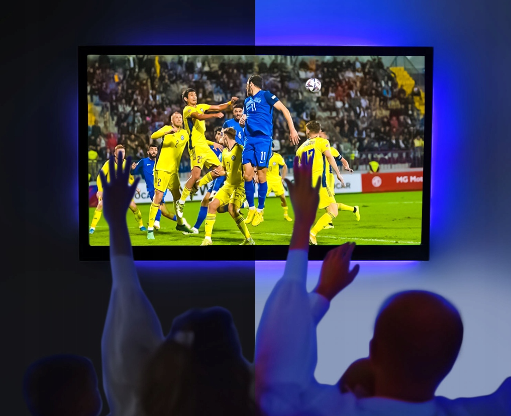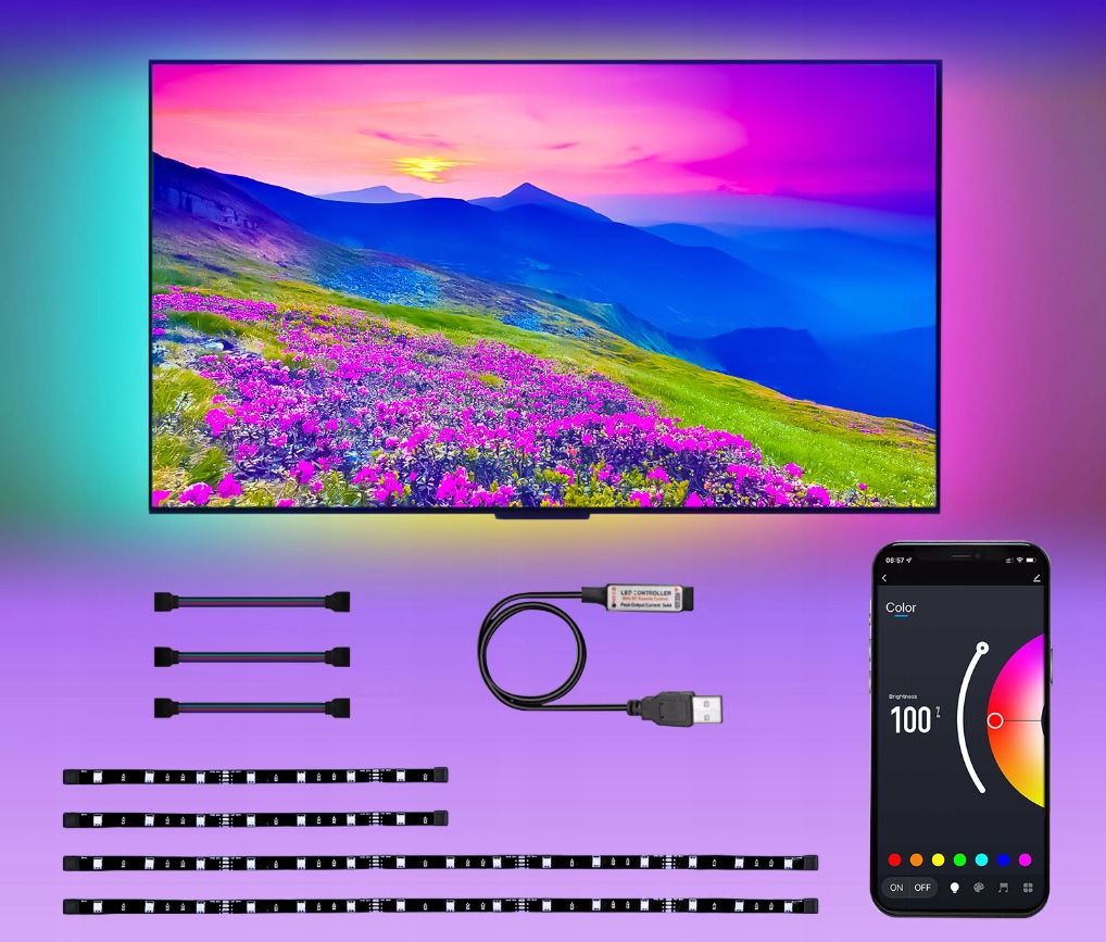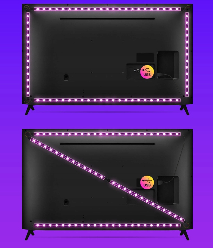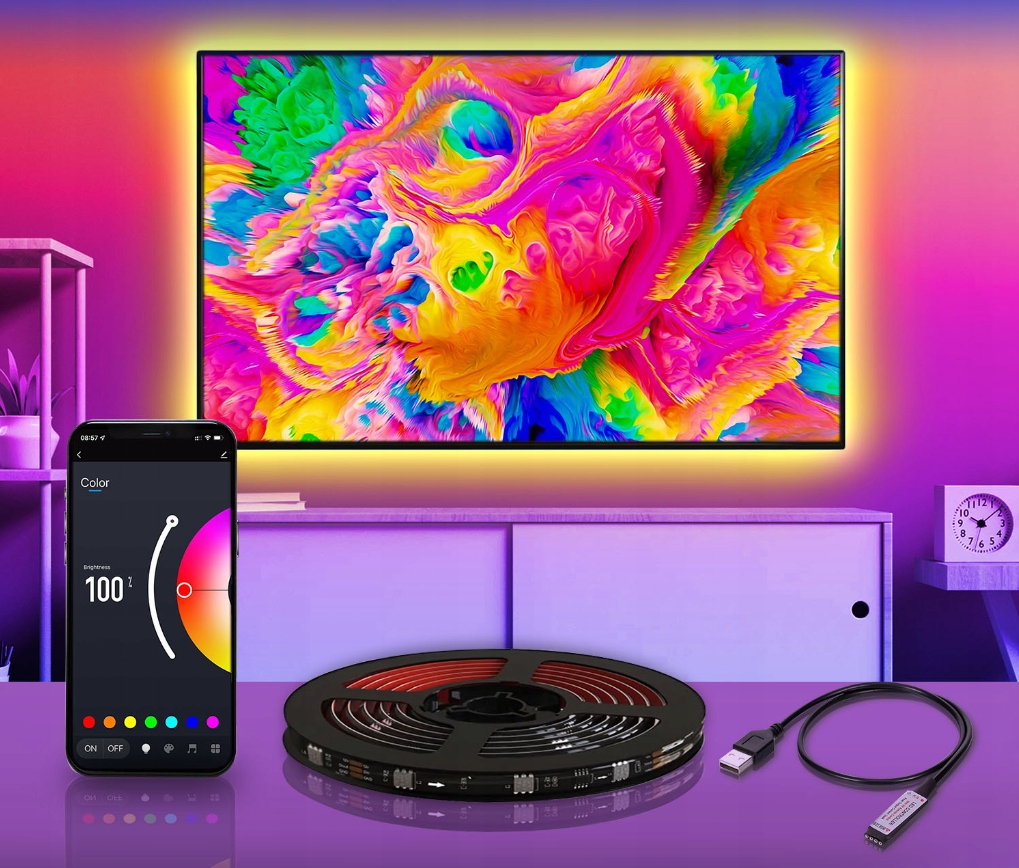 Inteligentna taśma LED RGB, montowana z tyłu telewizora o długości 3 m. Moc- 5 W. Standard komunikacji: Bluetooth Beacon technology.