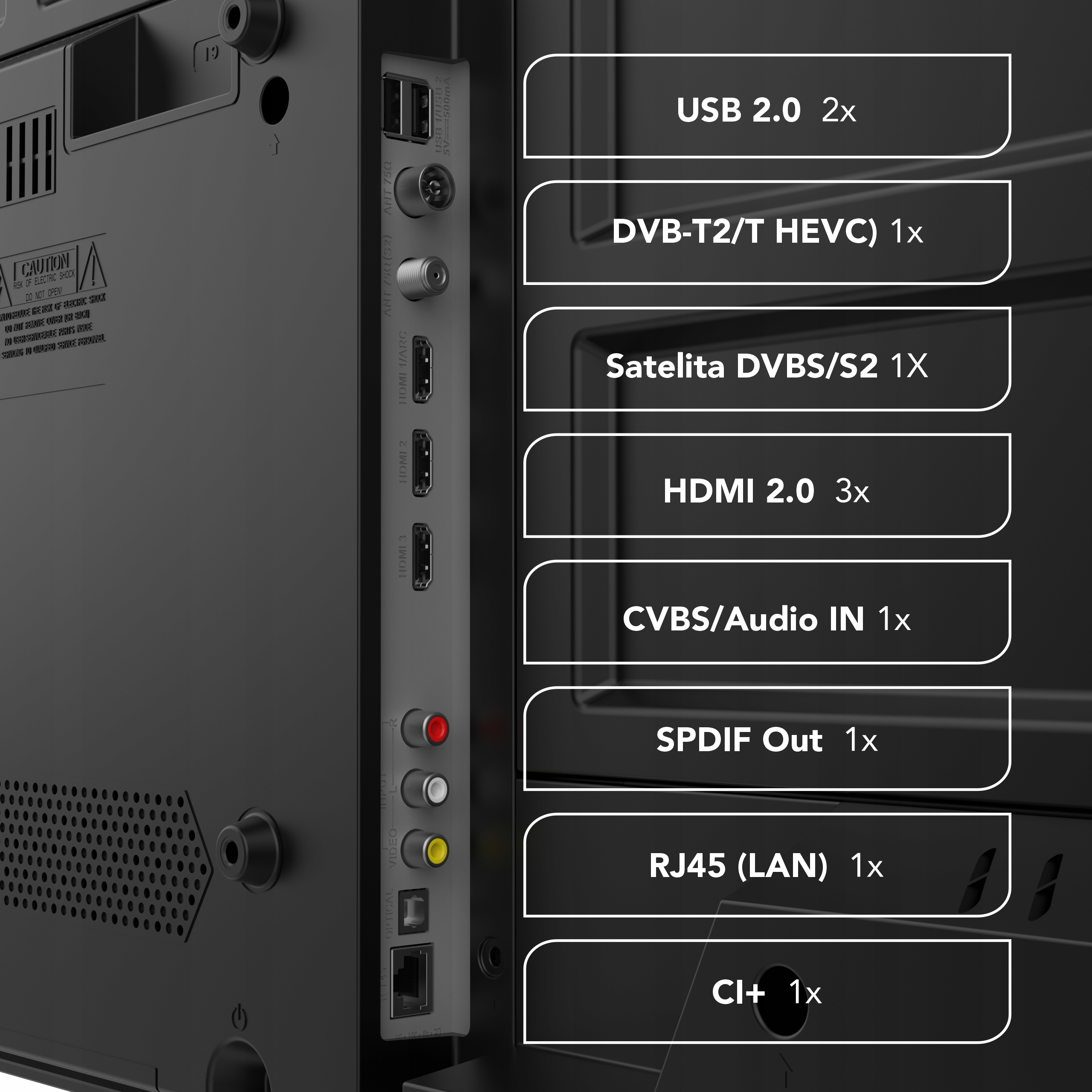 Telewizor posiada: HDMI, USB, wyjście optyczne audio, CI+, RJ45 (Ethernet), wejście antenowe, a także wyjście słuchawkowe.