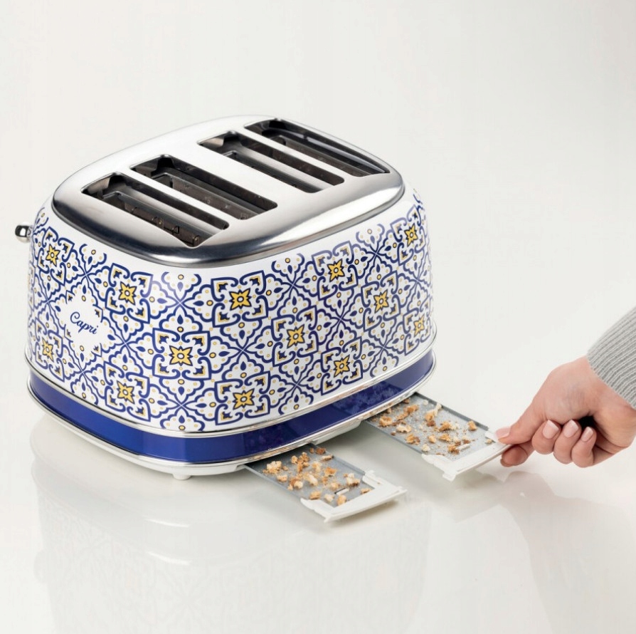 Toster Capri wyposażony jest w system automatycznego wyrzutu pieczywa, który pozwala uniknąć przypalenia grzanek. Dwie wysuwane tacki na okruchy ułatwiają utrzymanie czystości w kuchni, a możliwość zwinięcia kabla pod podstawą urządzenia zapewnia wygodne przechowywanie. Toster nie tylko ułatwia gotowanie, ale także dba o porządek w Twojej kuchni.
