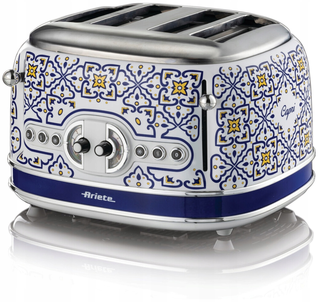 Toster na 4 grzanki z linii Capri, moc 1600 W, 6 poziomów opiekania, funkcje rozmrażania, podgrzewania i opiekania, wyśrodkowanie grzanek Self Centering, automatyczny wyrzut, funkcja przerwania opiekania, metalowy korpus, nienagrzewająca się obudowa cool touch, niezależne komory opiekania 2x2, antypoślizgowe nóżki, 2 wyjmowane tacki na okruchy, miejsce na zwinięcie kabla, rozmiar grzanek do 38x139 mm, wymiary 32x29x20,5 cm