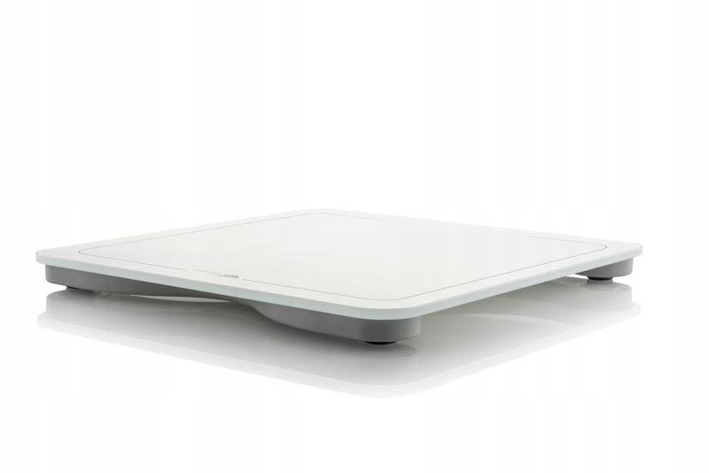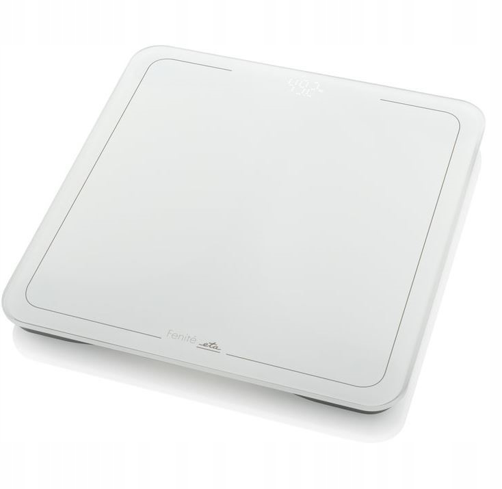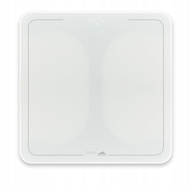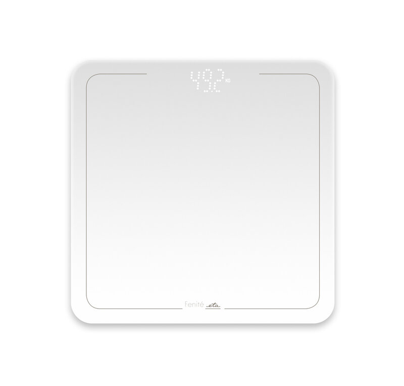 Waga osobista z kolekcji ETA Fenité w eleganckim białym designu. Szklana powierzchnia ważąca jest wykonana z szkła bezpieczeństwa o grubości 6 mm. Segmenty na ekranie LED są podświetlone w białym kolorze.