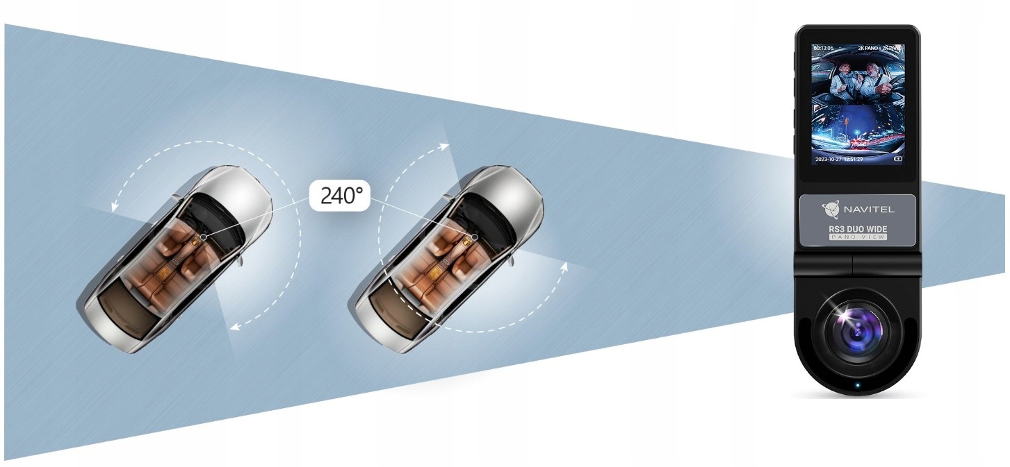 NAVITEL RS3 DUO WIDE widzi wszystko dzięki dwóm kamerom. Każda kamera ma kąt widzenia 240°, co razem daje 480°. Dzięki temu, będzie widoczny każdy szczegół: czy to pieszy na chodniku, przejeżdżający obok pojazd, czy nawet patrol policji zbliżający się do kierowcy.