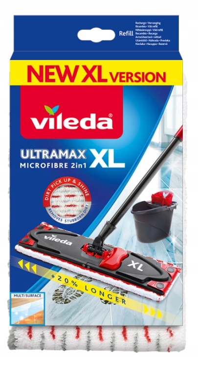 Wkład Ultramax teraz w nowej, większej odsłonie. Dobrze znany wkład z systemem 2w1 zapewnia czyszczenie białymi włóknami najdelikatniejszych powierzchni bez zarysowań, czerwone włókna odpowiadają za usuwanie najbardziej uporczywego brudu oraz wszelkich drobin.