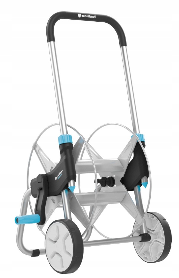 Wykonany z wysokiej jakości stali i aluminium, kształt bębna ułatwia nawijanie węża i zapobiega jego załamywaniu się, funkcjonalna składana korbka o ergonomicznym kształcie, szeroki rozstaw kół zapewnia łatwe i stabilne prowadzenie, konstrukcja wózka umożliwia wygodne przewożenie i przechowywanie długich odcinków węża, wbijane nóżki zapewniające stabilność wózka w trakcie rozwijania węża, regulowana długość rączki, wygodny, gumowany uchwyt rączki