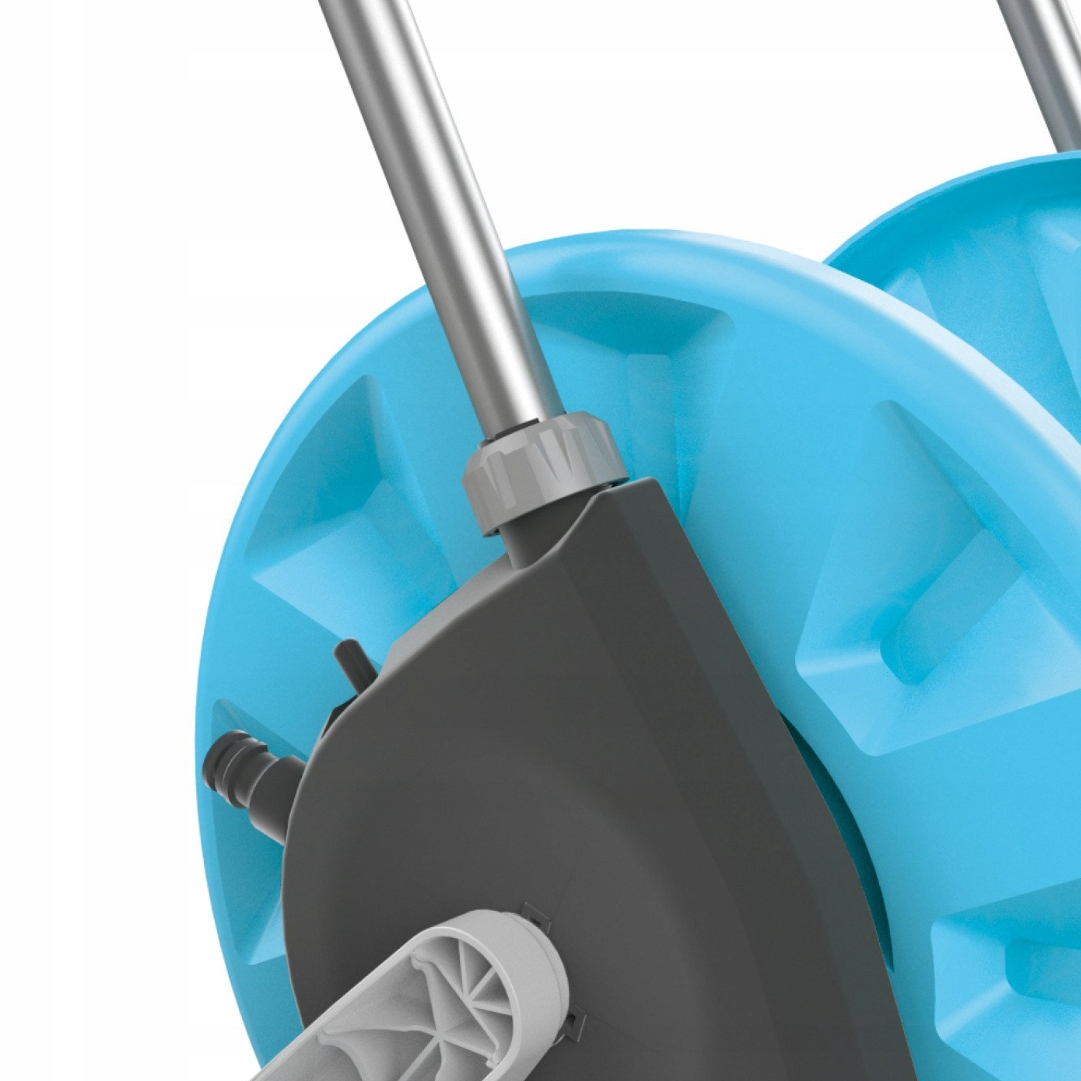 Wbijane nóżki zapewniające stabilność wózka w trakcie rozwijania węża, rączka z wygodnym gumowanym uchwytem o regulowanej długości, funkcjonalna składana korbka, uchwyty do wygodnego przechowywania szybkozłączy i zraszaczy, ergonomiczna składana stopka, aluminiowe rurki odporne na korozję, wzmocniona konstrukcja kół