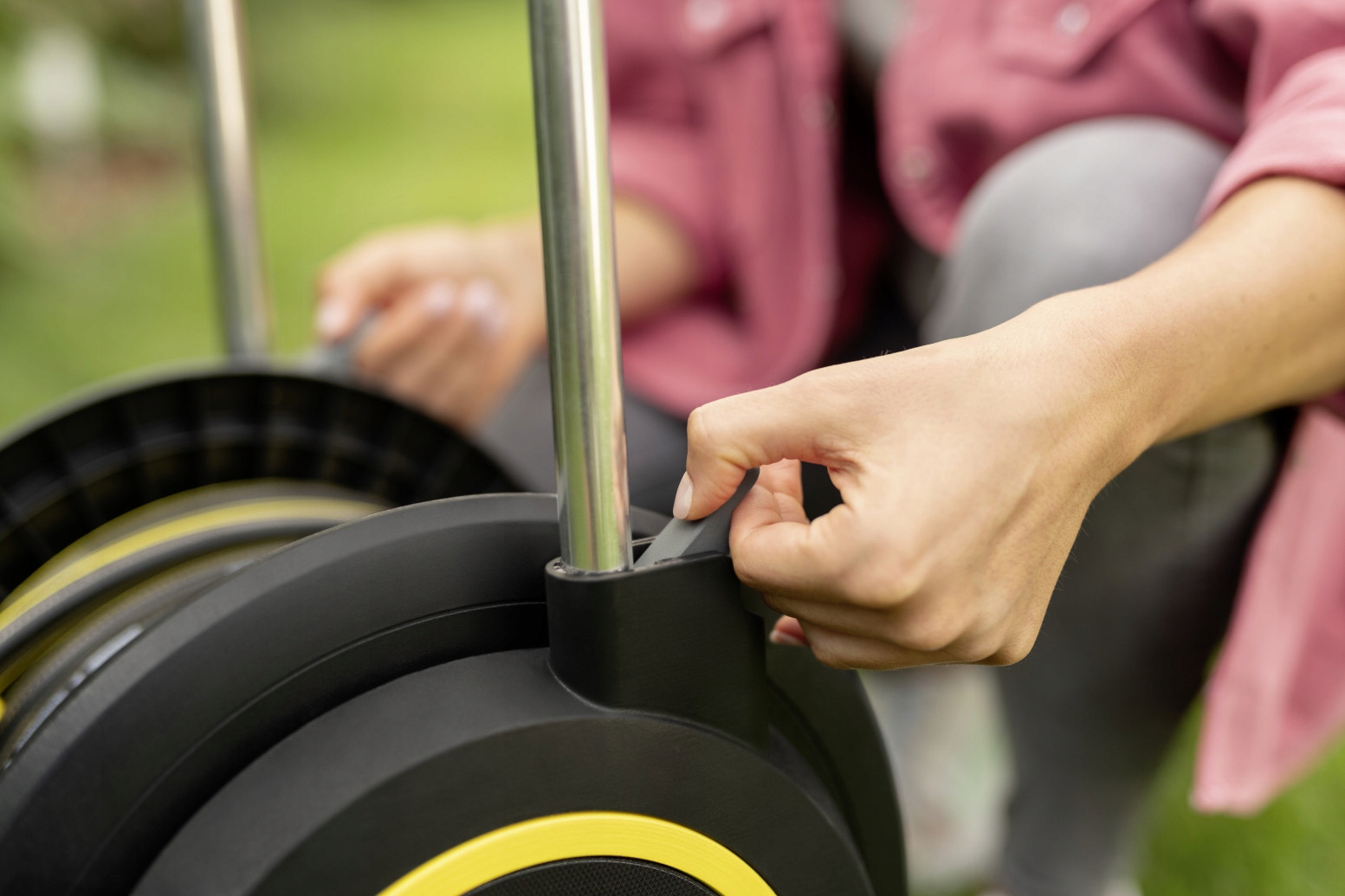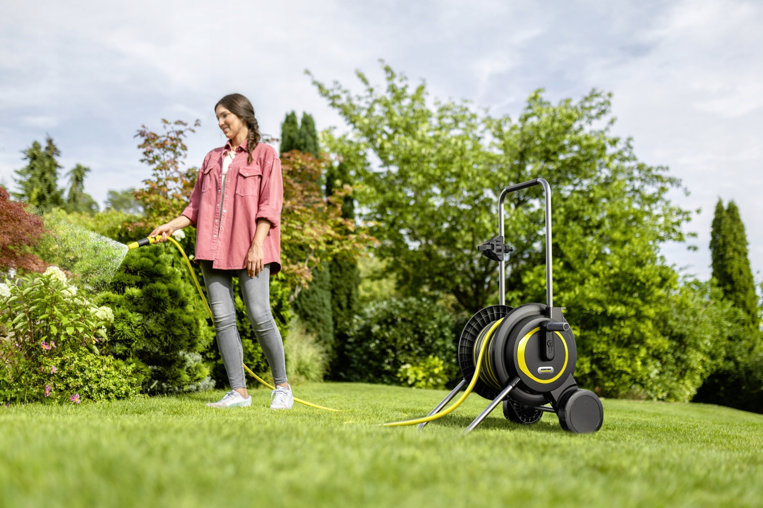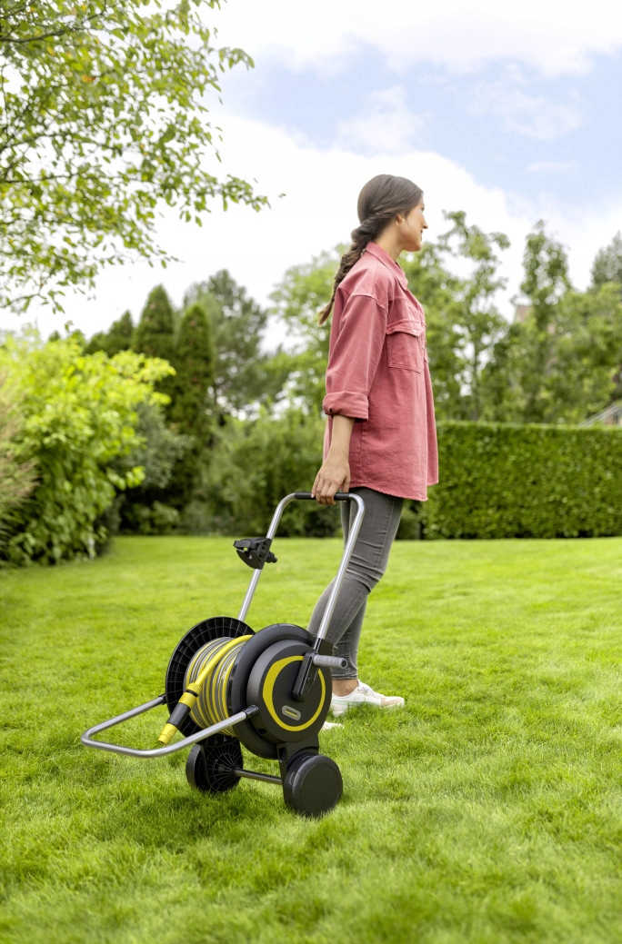 Mobilny i stabilny: Wózek na wąż do średnich ogrodów wyróżnia się wyjątkowo szeroką podstawą zapewniającą maksymalną stabilność i uchwytem o regulowanej wysokości. Zawiera uchwyt na dyszę.