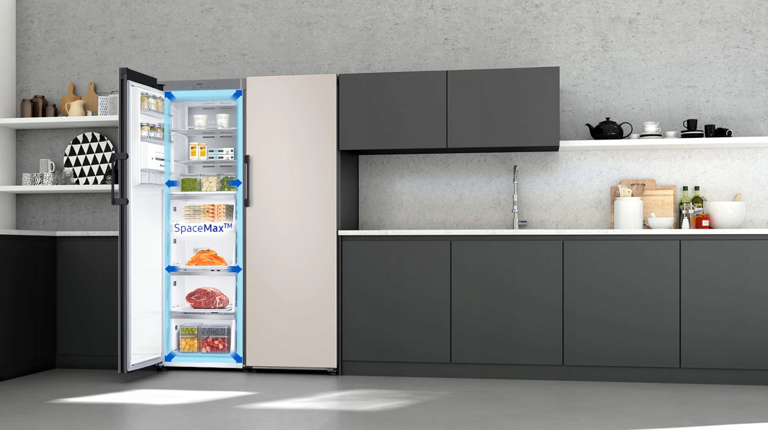 Dodaj odrobinę ekskluzywnej elegancji, która ulepszy Twoją kuchnię. Minimalistyczny, płaski design doskonale wpasuje się we wnętrze każdej nowoczesnej kuchni. Oznacz, również, że drzwi nie odstają, a zatem można otworzyć je na całą szerokość 90 stopni. Mogą być też łączone z innymi modułami BESPOKE, wyglądając spójnie niczym jedno urządzenie