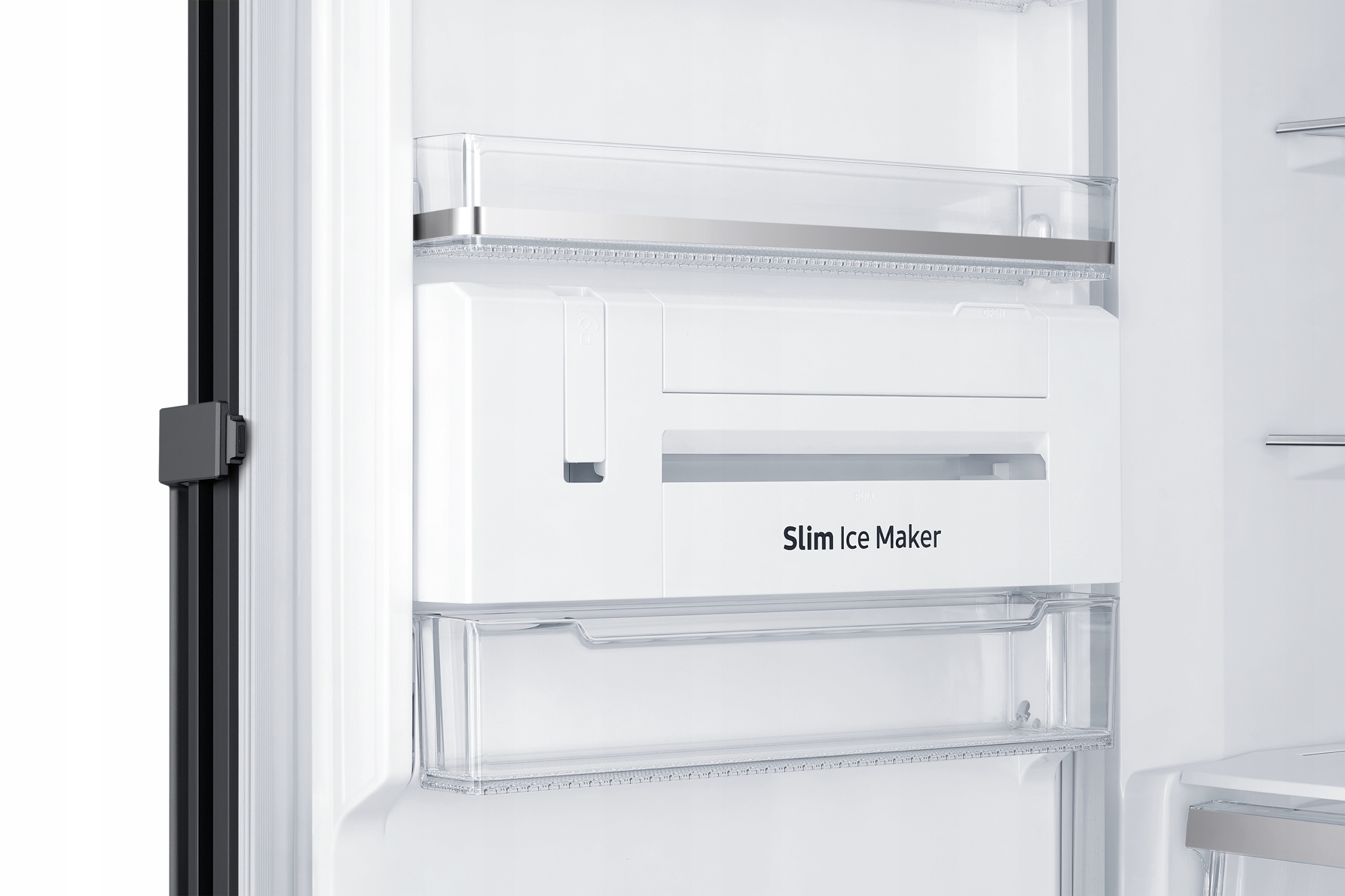 Ciesz się większą pojemnością lodówki, otrzymując jednocześnie wystarczającą ilość lodu. Smukła kostkarka do lodu jest wbudowana w drzwi lodówki, dzięki czemu zyskujesz więcej miejsca, zwalniając przestrzeń w zamrażarce. Wciąż może ona jednak przechować mnóstwo lodu, a przezroczysta przegroda pozwala łatwo sprawdzić, ile go jeszcze zostało.