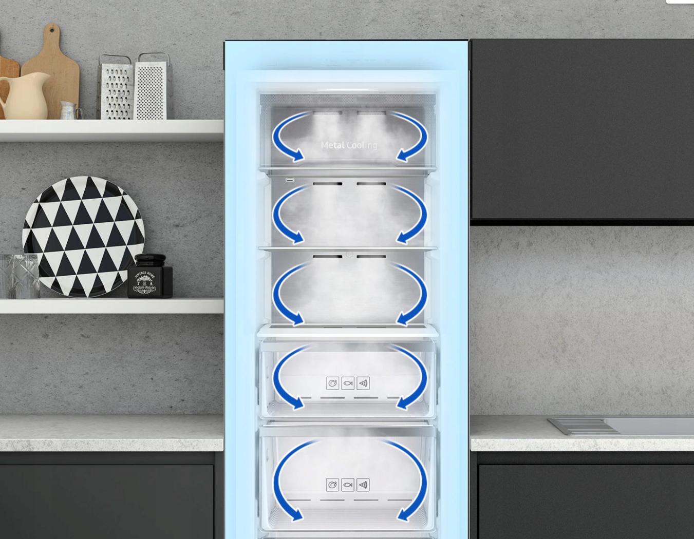 Technologia Metal Cooling to doskonała izolacja i niezwykła efektywność chłodzenia. Specjalny metalowy panel tylnej ścianki urządzenia kumuluje niską temperaturę, dzięki czemu doskonale zatrzymuje zimno we wnętrzu lodówki nawet przy jej częstym otwieraniu. Zapewnia oszczędność czasu chłodzenia i energii.
