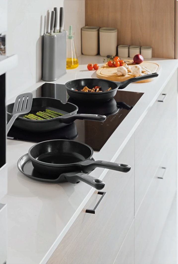 Te patelnie o idealnych rozmiarach (20 cm i 24 cm) zostały zaprojektowane tak, aby pomóc w przygotowaniu porannego śniadania lub wieczornej kolacji. Patelnia grillowa (26 cm) sprawdzi się idealnie do przygotowania zdrowego obiadu, podczas gdy patelnia do naleśników (25 cm) pomoże Ci przyrządzić słodki deser!