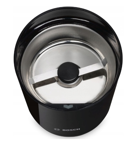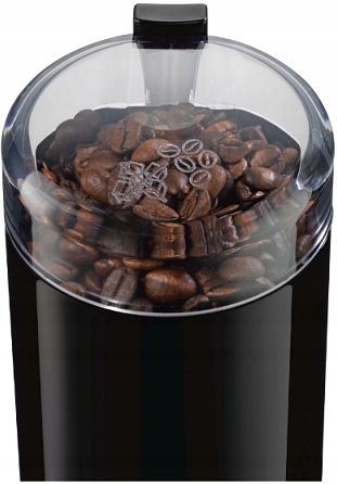 Młynek elektryczny do kawy o mocy 180 W, pojemności 75 g, z nożem dwuskrzydłowym ze stali szlachetnej oraz z zabezpieczeniem przed uruchomieniem bez pokrywy.
