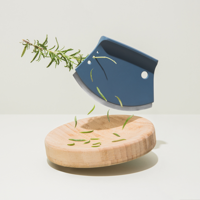 Harmonijna krzywizna noża i delikatnie wklęsła miska do krojenia, tworzą idealne połączenie, dzięki czemu siekanie siół będzie na prawdę proste. Potrzebujesz rozmarynu lub tymianku? Wystarczy włożyć łodygi ziół do jednego z czterech otworów w korpusie noża, przeciągnąć je i posiekać opadłe liście na misce do krojenia.