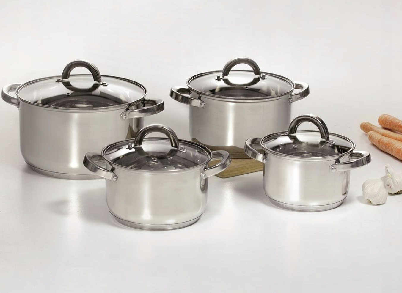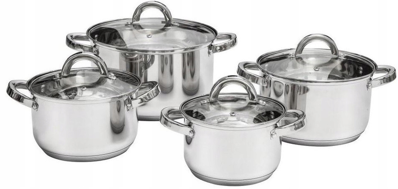 Komplet garnków ze stali nierdzewnej Berry 8-elementowy, 4 garnki z pokrywkami ze szkła hartowanego.