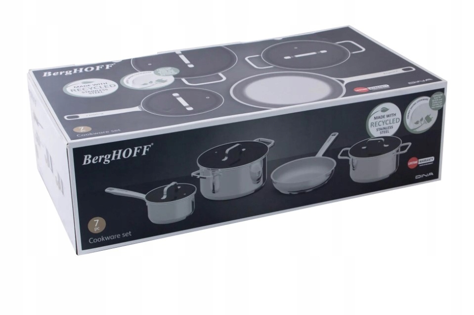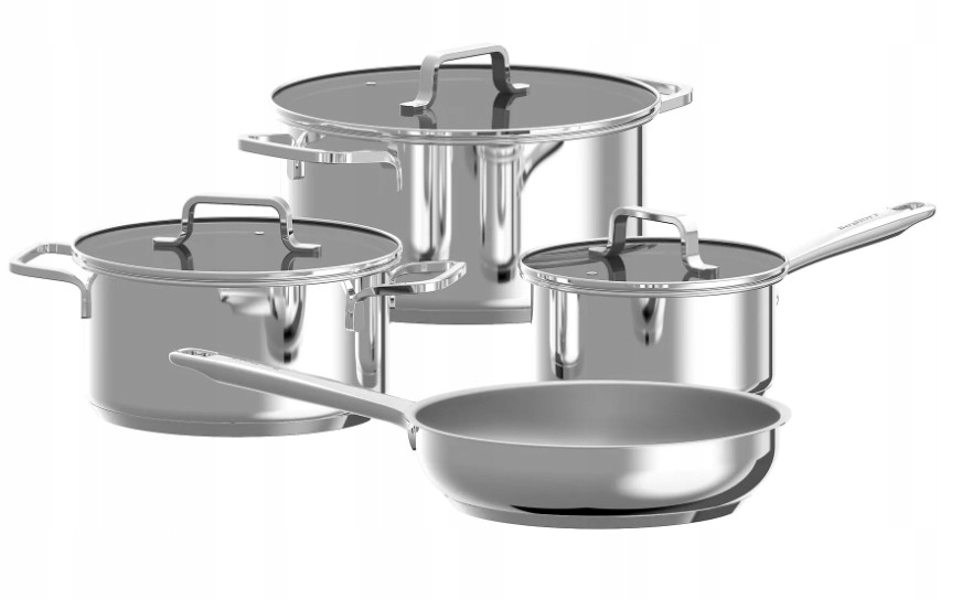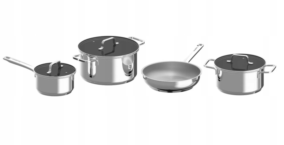 Ten zestaw składa się z rondla z pokrywką, 2 garnków z pokrywkami (20 i 24 cm) oraz patelni (24 cm), całość wykonana jest ze stali nierdzewnej pochodzącej z recyklingu. Satynowe wykończenie nadaje tym przedmiotom stylowy wygląd. Stal nierdzewna zapewnia dodatkową trwałość i higienę, a kapsułowa podstawa garnków szybko i równomiernie rozprowadza ciepło po całej powierzchni na każdym rodzaju kuchenki, w tym na indukcji. Solidny uchwyt patelni ułatwia przenoszenie jej z płyty kuchennej na stół. Wszystkie elementy zestawu można myć w zmywarce i używać w piekarniku do 230°C.