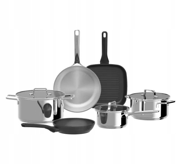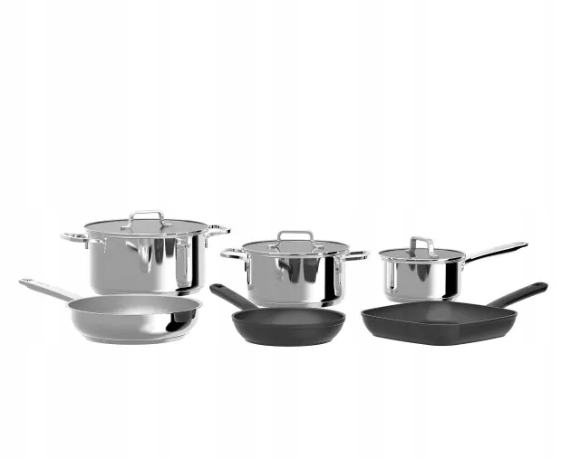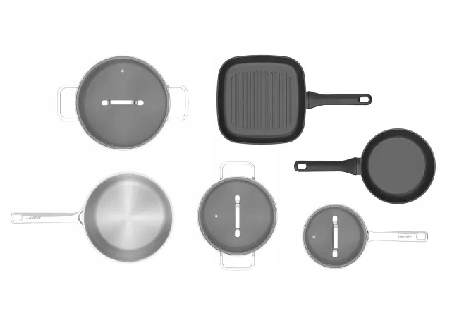 Zestaw zawiera zarówno garnki i patelnie wykonane ze stali nierdzewnej pochodzącej z recyklingu jak i naczynia wykonane z powlekanego aluminium pochodzącego z recyklingu. Rondel, garnki o średnicy 20 cm i 24 cm oraz patelnia o średnicy 24 cm zostały wykonane ze stali nierdzewnej pochodzącej z recyklingu i mają stylowe, satynowe wykończenie.