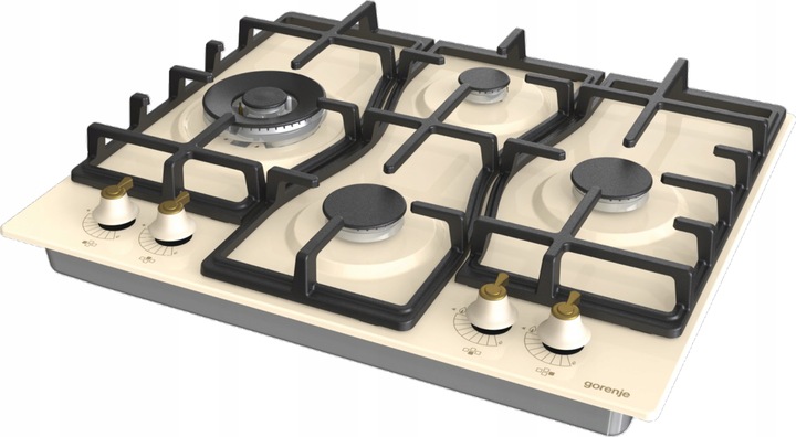 Płyta gazowa Gorenje GW6D42CLI o stylowym wyglądzie, szerokości 60cm, w kolorze kremowym, z żeliwnymi rusztami.