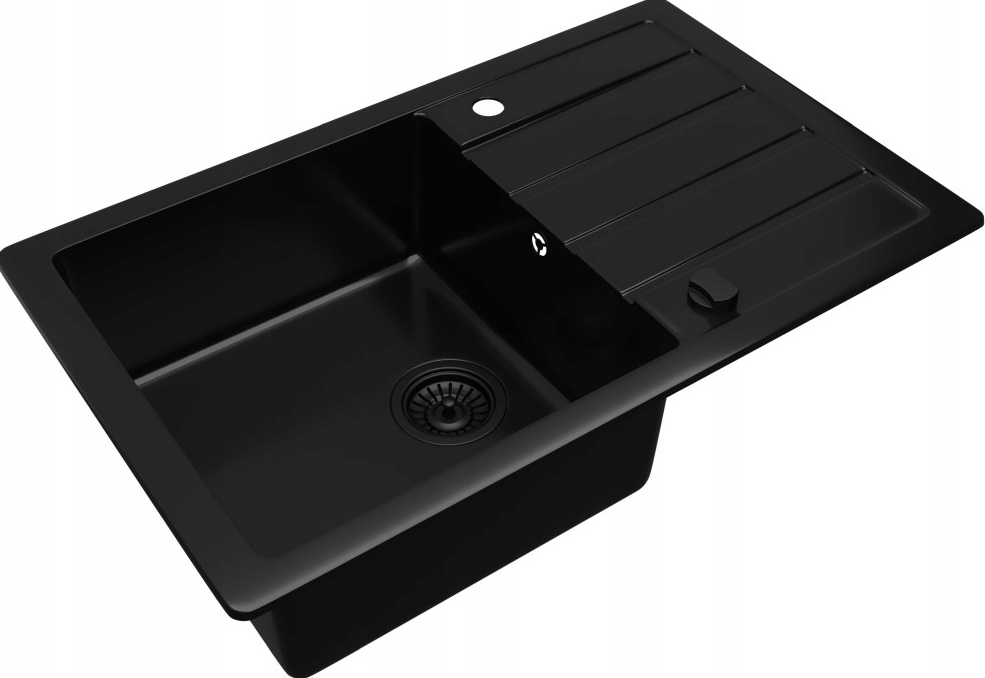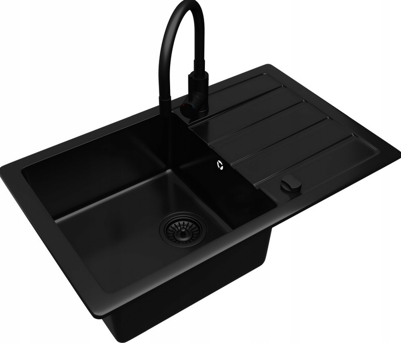Zlewozmywak jest wykonany z jednolicie czarnego granitu o nasyconej barwie. Bateria jest połączeniem czerni i klasycznego inoxu, czyli stali nierdzewnej. Taka kolorystyka wygląda dobrze w każdej nowoczesnej kuchni - stylowo i ponadczasowo.