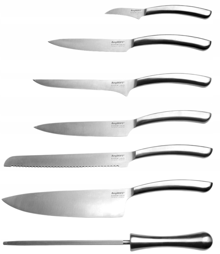 - Zawartość zestawu: 1 x nóż do obierania 6,5 cm 1 x nóż uniwersalny 12 cm 1 x nóż uniwersalny 15 cm 1 x nóż do trybowania 15 cm 1 x nóż szefa kuchni 23 cm 1 x nóż do pieczywa 23 cm 1 x ostrzałka 23 cm
