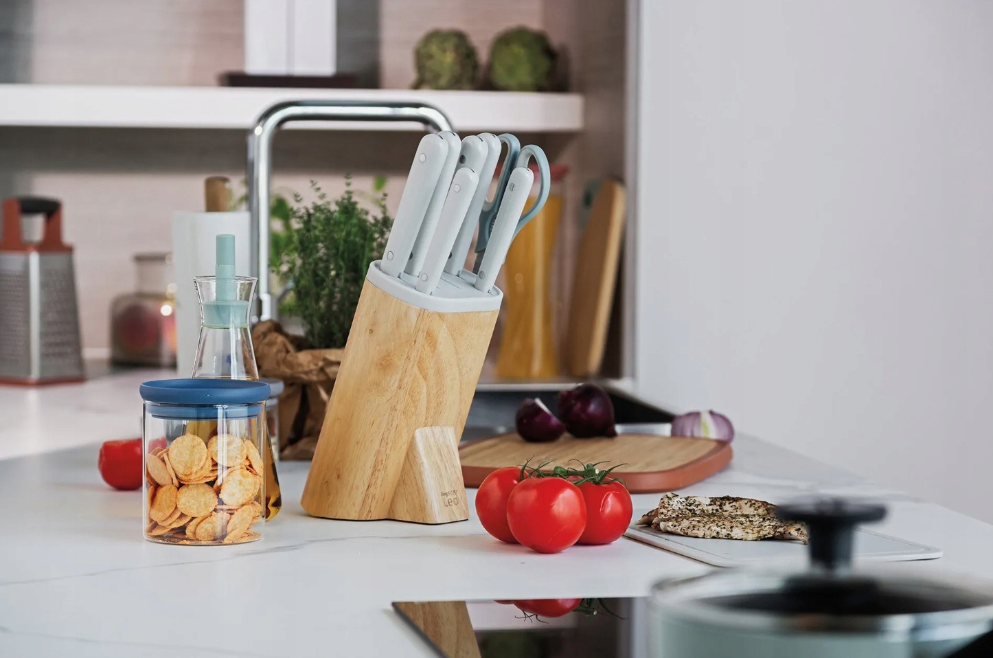 Nasz nowy 7-częściowy zestaw noży w bloku wniesie design i innowację do Twojej kuchni i subtelnie doda trochę koloru do każdego wnętrza! Zestaw zawiera wszechstronną gamę noży, takich jak nóż do obierania, nóż uniwersalny, nóż do wędlin, nóż do chleba, nóż szefa kuchni i nóż Santoku. W pięknie zaprojektowanym drewnianym bloku z błyszczącym wykończeniem możesz z łatwością i w uporządkowany sposób przechowywać wszystkie noże, aby przygotowywanie posiłków było jeszcze bardziej wydajne. Otwory na noże są zaprojektowane tak, aby idealnie pasowały do nasady noża, dzięki czemu masz 100% pewności, że nóż jest bezpiecznie przechowywany. Zintegrowany silny magnes z boku bloku umożliwia wygodne przechowywanie nożyczek lub innych magnetycznych narzędzi kuchennych.