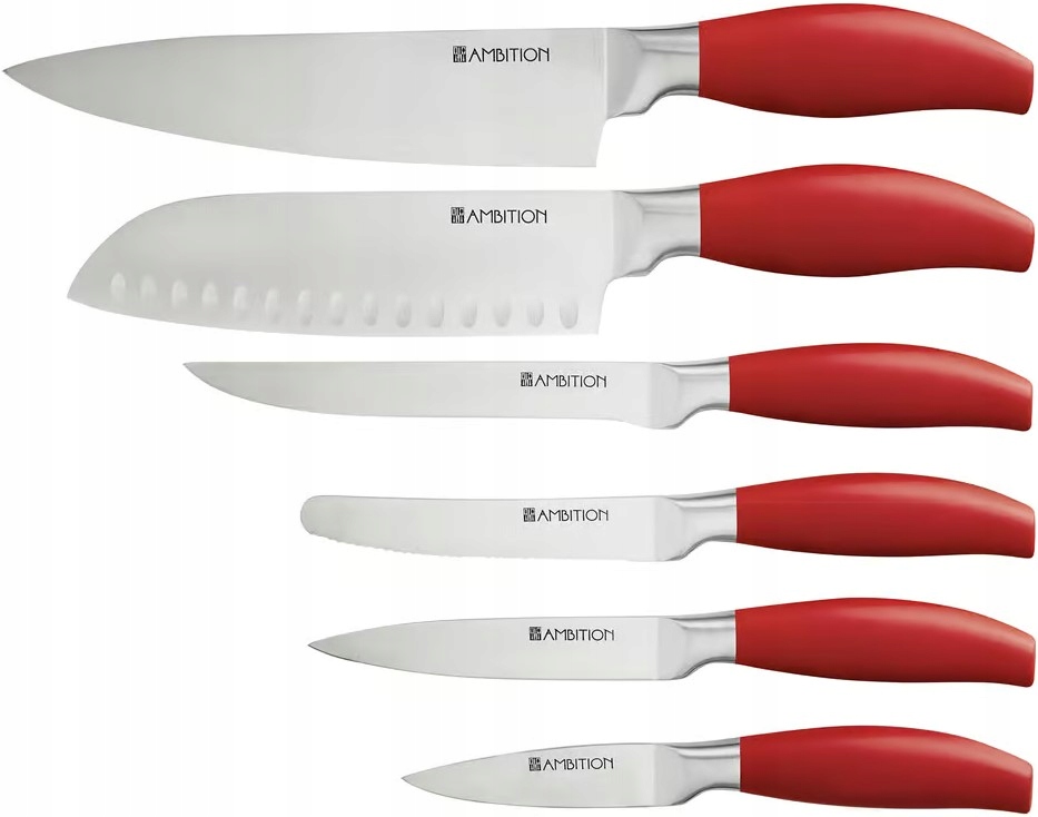 Zestaw noży Ambition Ombre w odcieniu czerwieni to nieodzowny element każdej kuchni. Składa się z 6 noży, każdy zaprojektowany z myślą o innej funkcji. Ostrza wykonane są ze stali nierdzewnej, co gwarantuje ich trwałość i ostrość. Blok noża, w którym są przechowywane, wykonany jest z solidnego drewna. Rękojeść noży pokryta jest powłoką SoftTouch, która zapewnia komfort i bezpieczeństwo podczas użytkowania. Zestaw zawiera nóż szefa kuchni, Santoku, do filetowania, uniwersalny, do warzyw i owoców oraz do obierania. Ułatwia i uatrakcyjnia pracę w kuchni.