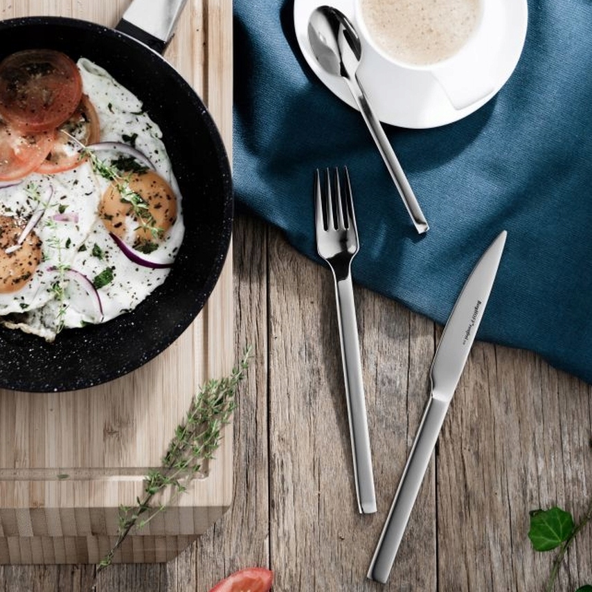 Proste, ale dynamiczne sztućce Essence emanują męskością wyróżniającą się na stole. Projektant Ralph Kraemer stworzył precyzyjny i harmonijny zestaw sztućców, który idealnie równoważy proste formy z wyraźnymi krzywiznami. To połączenie nowoczesnego designu i funkcjonalności nadaje sztućcom proporcjonalny i symetryczny wygląd.