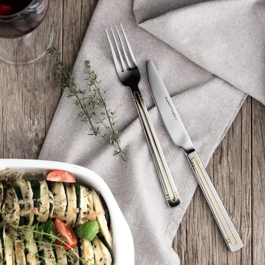 Umieszczając sztućce Heritage na stole w jadalni, czujesz się jak prawdziwa gwiazda! Zestaw posiada oszałamiające złote zdobienia po obu stronach uchwytu, które natychmiast nadają sztućcom wyrafinowany wygląd. Prostokątna powierzchnia uchwytów tworzy harmonijną równowagę z zakrzywionymi zakończeniami sztućców. Dzięki połączeniu wdzięcznych konturów z lekkim, wygodnym uchwytem, projektant Ralph Krämer wyczarował elegancję, która czyni ten zestaw ponadczasowym dodatkiem na Twoim stole.