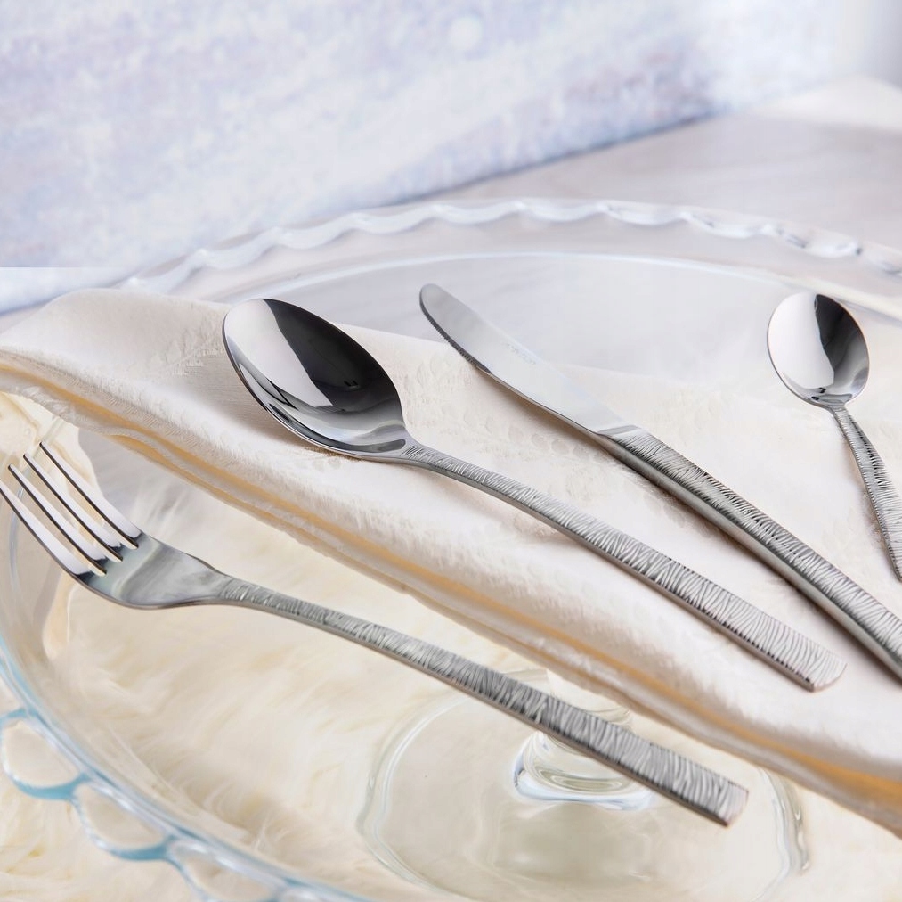 Komplet sztućców River 24-elementowy wykonany z wysokiej jakości stali nierdzewnej w stylu modern. Elegancja w najczystszym wydaniu. Przepięknie harmonizują z zastawą stołową o nowoczesnym charakterze. Ręczne polerowanie sprawia, że powierzchnia jest lśniąca. Prosta, ale niebanalna forma rączki delikatnie zdobiona prążkami,dodaje elegancji i nowoczesnego charakteru.