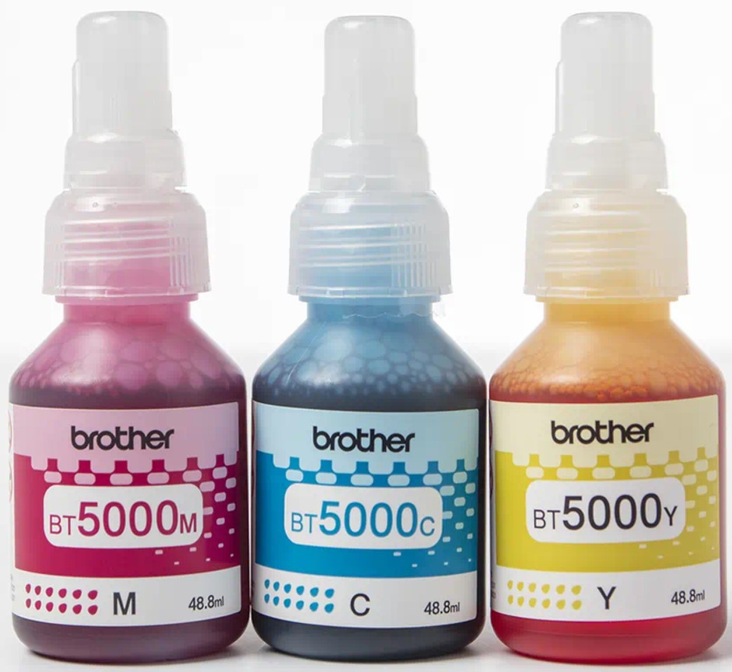 Zestaw Brother BT5000CLVAL, składający się z tuszów w 3 różnych kolorach. Super wysoka wydajność oznacza mniejszą liczbę wymian atramentu oraz niski koszt wydruku pojedynczej strony.