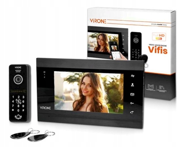 Zestaw wideodomofonowy Virone VDP-61FHD, to nowoczesne urządzenie z kolorowym i ultra płaskim monitorem LCD o przekątnej 7'' kamera Full HD 1080P, z szyfratorem i czytnikiem kart.