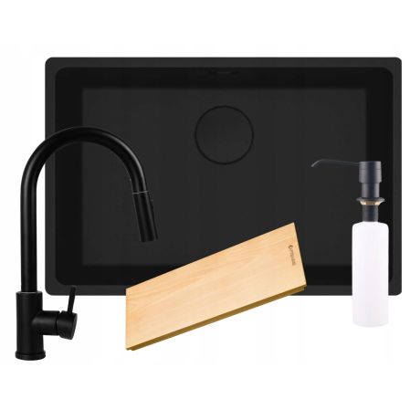 Zestaw Zlewozmywak granitowy Franke Maris MRG 110-62 Czarny mat/czarny odpływ + Bateria kuchenna Pyramis Idea Czarny mat stojąca+ Dozownik kuchenny do płynu Pyramis DP-01 Volcano+Deska drewniana Pyramis do zlewozmywaka Siros 47x51,5 1B