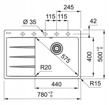 Zlewozmywak 1-komorowy z ociekaczem o wymiarach 780 x 500 mm. Wykonany z fragranitu+. Dedykowany do szafek o szeroko?ci 500 mm. Odporny na powstawanie plam i przebarwie?, zarysowania, promieniowanie UV oraz uderzenia.