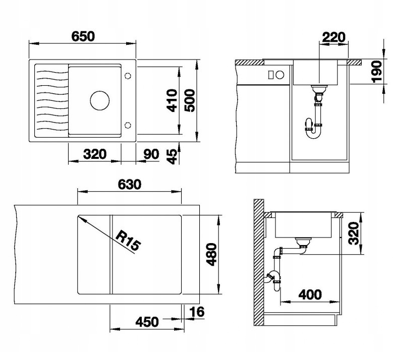 - Armatura przelewowo-odpływowa zapewniająca więcej miejsca w szafce