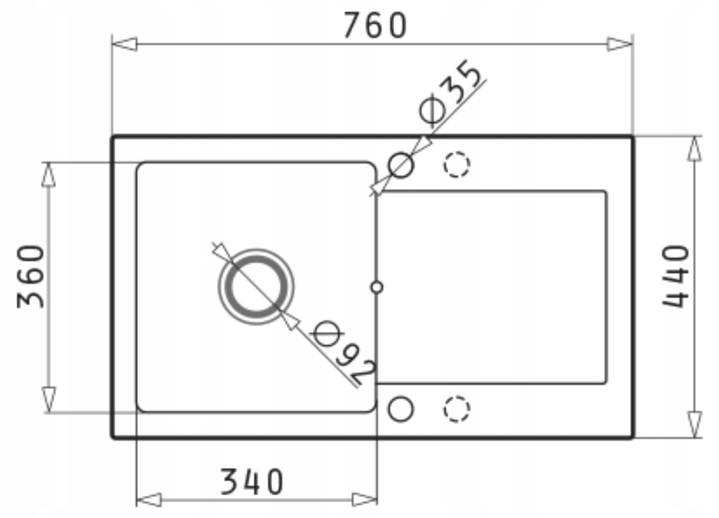 Zlewozmywak 1-komorowy wykonany z pyragranitu o wymiarach 760 x 440 mm. Minimalna szerokość szafki: 450 mm.