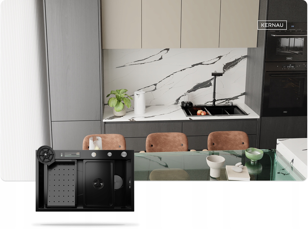 System szynowy w zlewozmywaku KERNAU KSS F umożliwia wygodne przesuwanie koszyka ociekowego lub koszyka z zamykanym odpływem w dowolne miejsce na powierzchni zlewu. To rozwiązanie pozwala na lepszą organizację przestrzeni roboczej i utrzymanie porządku w kuchni.