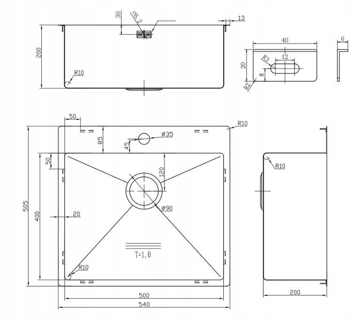 Zlewozmywak jednokomorowy o wymiarach 540 x 505 mm. Powierzchnia odporna na szok termiczny i uszkodzenia mechaniczne.