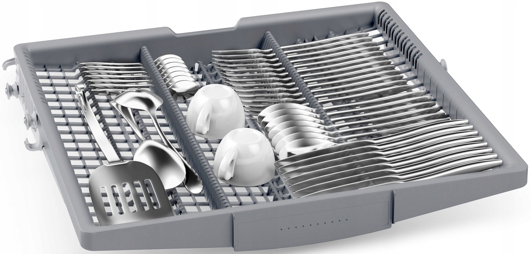 System regulacji położenia górnego kosza Rackmatic, służy dopasowaniu wnętrza do aktualnych potrzeb. System pozwala zmienić ustawienie kosza na różnych wysokościach, a wybraną pozycję można łatwo zmienić , nawet gdy kosz jest pełen. Dzięki temu możesz dostosować wnętrze do swoich potrzeb nawet dla bardzo wysokich talerzy w dolnym koszu, czy wysokich kieliszków czy kufli w górnym koszu.