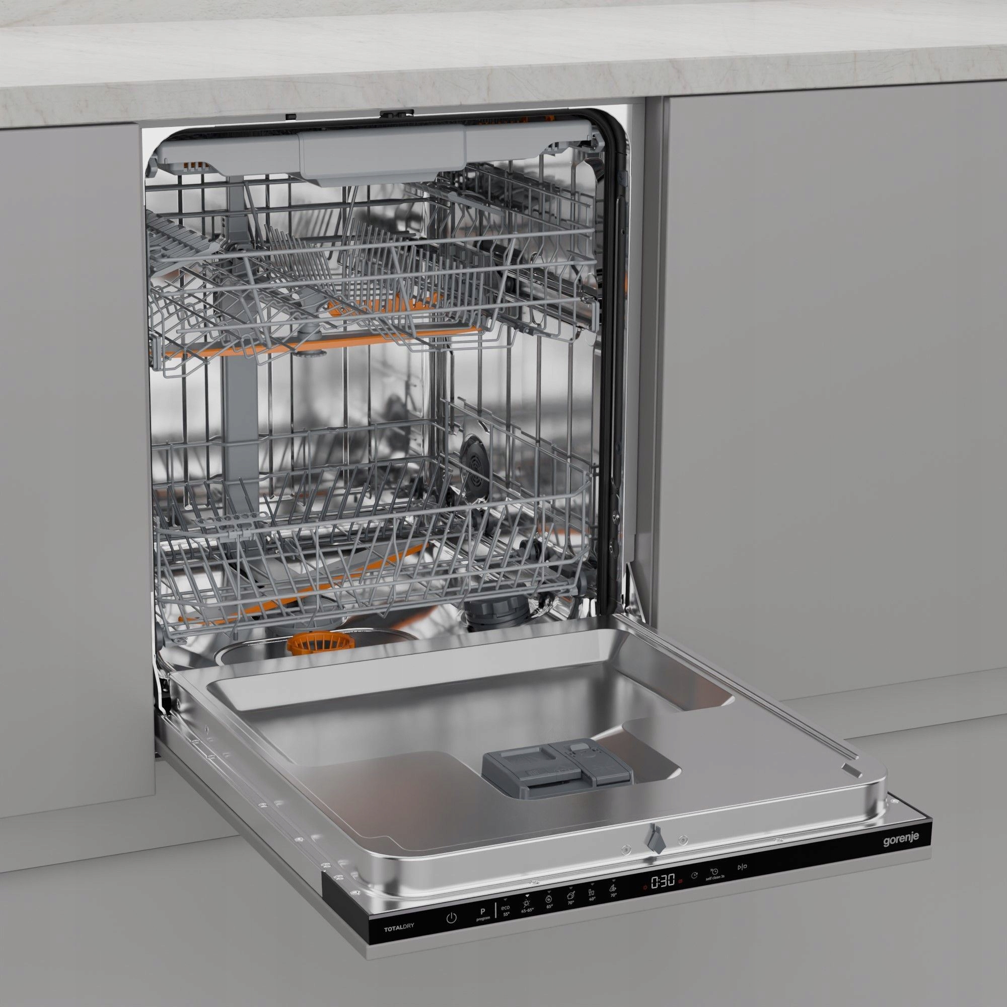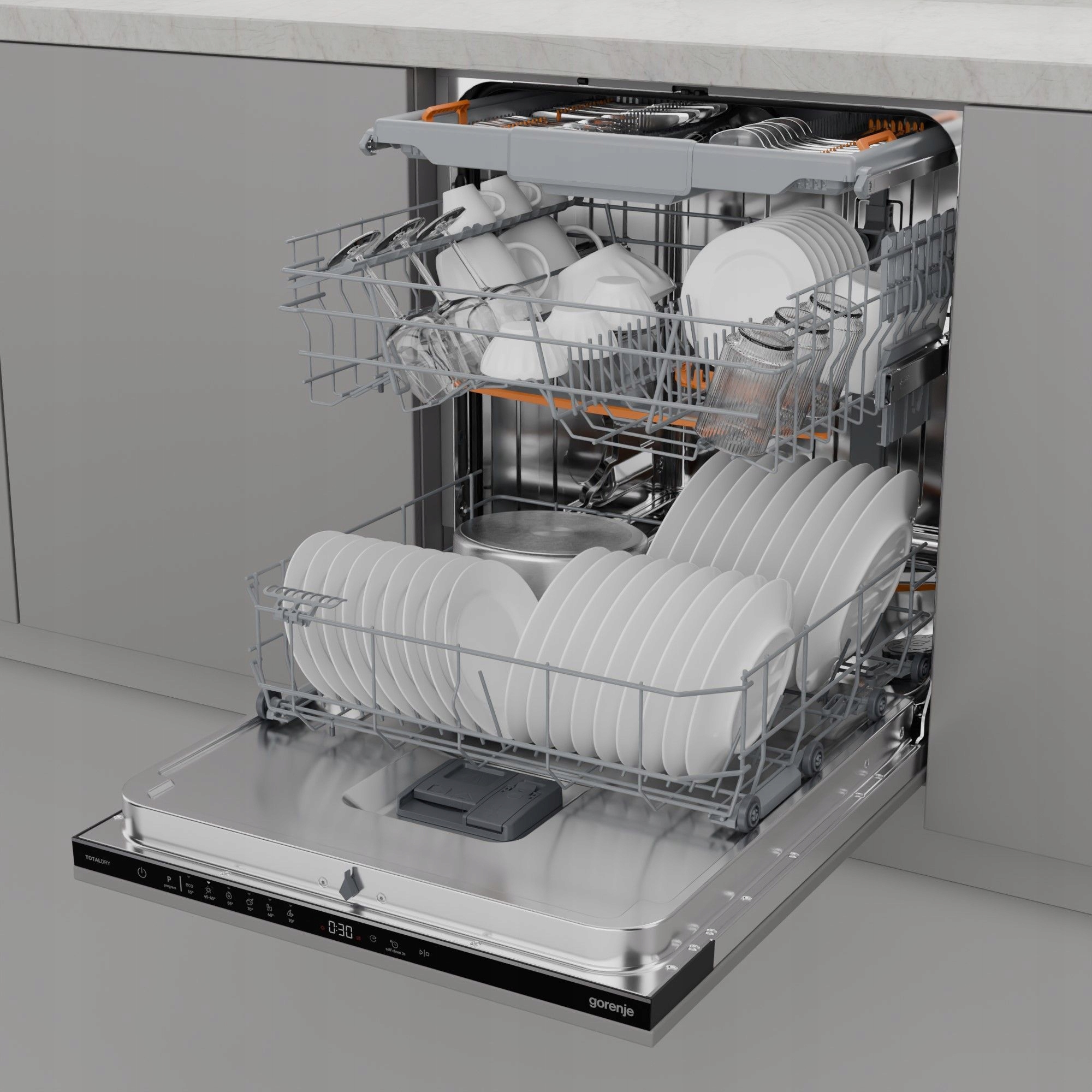 Kosze są wyposażone w wyraźnie oznaczone ruchome elementy, a konfigurowalny układ kosza znacznie ułatwia załadunek. Naprawdę prosty, dwustopniowy system regulacji kosza umożliwia dopasowanie nawet do największych garnków i talerzy. Stojak na talerze w dolnym koszu można łatwo złożyć. Sztućce można idealnie uporządkować na specjalnej tacy, gdzie są one umieszczone oddzielnie, co zapewnia doskonałe rezultaty czyszczenia i suszenia. Każdy szczegół został starannie zaprojektowany pod kątem jak najłatwiejszej obsługi.
