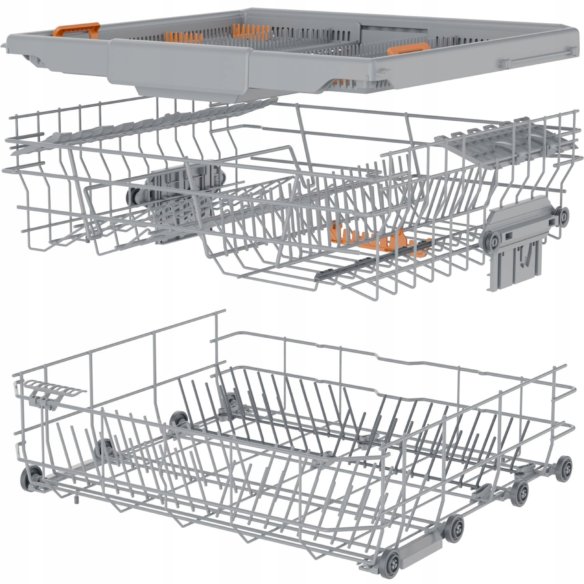 - Górny kosz: 3 cup holders, Szeroki uchwyt na duże noże, Stałe wsporniki na szkło, Wsporniki talerzy zamocowane na stałe, Lewy składany uchwyt na filiżanki, Prawy składany uchwyt na filiżanki, Lewy składany uchwyt na filiżanki, Szeroka podstawa