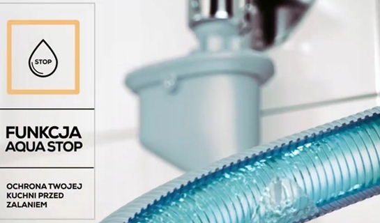 Eliminuje ryzyko zalania kuchni w wyniku awarii urządzenia. Po pojawieniu się niekontrolowanego wycieku, dopływ wody do zmywarki zostaje automatycznie odcięty.