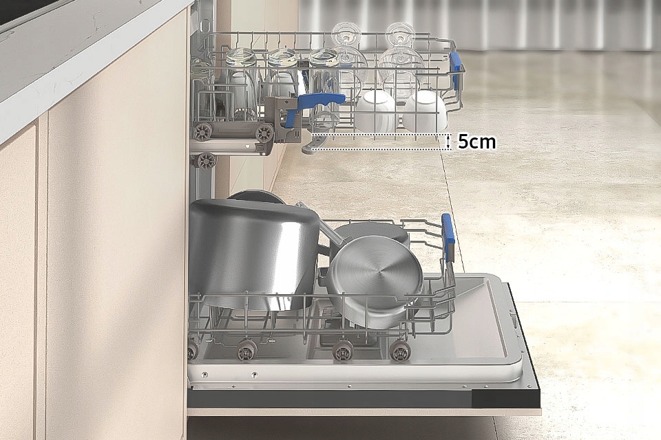 Chcesz umyć wysoki wazon lub duży garnek? Żaden problem! Nasza zmywarka pozwala na łatwą regulację wysokości górnego kosza (podniesienie lub opuszczenie o 5 cm), dzięki czemu idealnie dopasujesz ją do swoich potrzeb. Zyskaj więcej przestrzeni i komfort użytkowania.