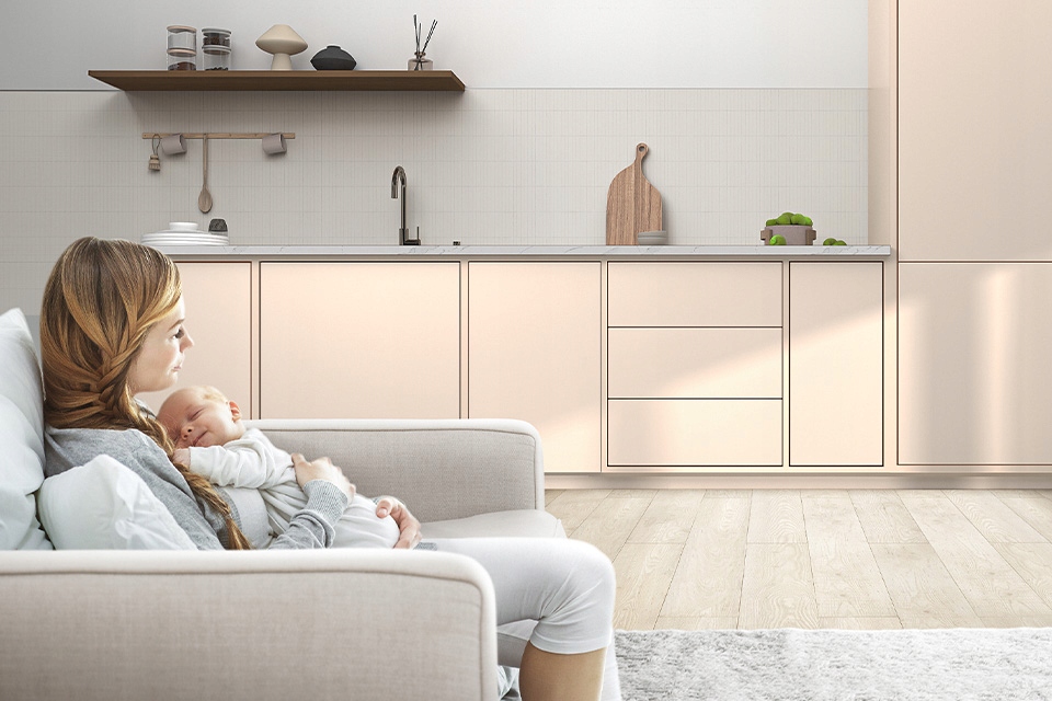 Ciesz się chwilą wytchnienia, nawet gdy zmywarka pracuje. Dzięki specjalnej konstrukcji komory ze stali nierdzewnej, nasze urządzenie pracuje wyjątkowo cicho. Pochłaniając znaczną część hałasu, zapewnia przyjemną atmosferę w kuchni. Zaledwie 44 decybele – to mniej niż szept.